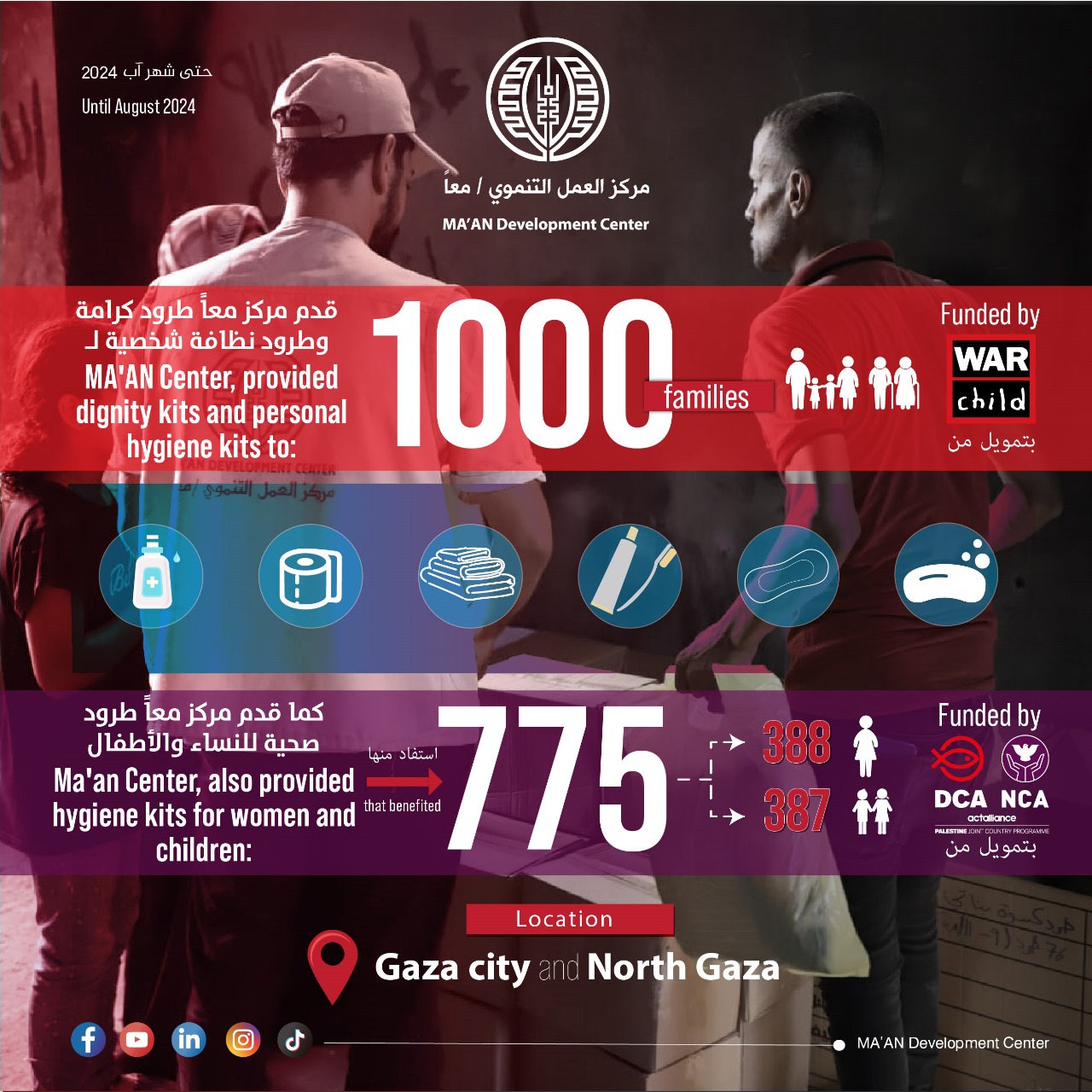 إضافة الى قام المركز بتوزيع طرود صحية وطرود كرامة استفاد منها (1000) أسرة في مناطق شمال قطاع غزة ومدينة غزة. بتمويل من مؤسسة طفل الحرب War Child.