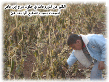 وقف المزارع علاء الدين محمد، أمام حقله الممتد في مرج ابن عامر، ليشاهد بأم عينه الخسائر الفادحة التي نتجت عن موجة الصقيع، وأخذ يروي بملامح حزينة: "تصوروا حتى أشجار الليمون وقممها النامية تلفت تماماً، وأشتال الملفوف والقرنبيط حرقت، والفول أبيد، ونباتات العلت (العلك) أيضا تضررت لأول مرة، والكوسا المحمية بالنايلون أصبحت أثراً بعد عين، ولم يبق لنا أي شيء، أي شيء". يعترف علاء بأن ممارسات الفلاحين غير الصديقة للبيئة شريكة في جريمة تدمير البيئة مع تبدّل أحوالها المناخية، وقلة المطر وارتفاع درجات الحرارة؛ يكفي للتأكد من ذلك أن تشاهد مئات العبوات الفارغة من الأدوية الكيماوية الخطرة والسامة والأسمدة غير الطبيعية، أو حرق أكوام النايلون، والغازات السامة التي تستخدم في البيوت البلاستيكية". ويضيف: "إذا اعتقدنا أن الصقيع يأتي من فراغ، فنحن واهمون. صحيح أنه بيد الله أولاً وأخيراً، إلا أن له الكثير من الأسباب، ونحن في النهاية شركاء، ولو بجزء بسيط في التسبب بحدوث الانجماد". سمع علاء وقرأ من وسائل الإعلام، عن تاريخ موجات الصقيع، التي كانت أقساها في شتاء عام 1974، حين شهدت الأراضي الفلسطينية المحتلة أعنف حالة صقيع وانجماد، واستمرت 17 يوماً. ويتابع قائلاً:" فعلنا ما بوسعنا لمواجهة الصقيع، لكننا للأسف فشلنا. ويكفي أن نتذكر قصة أحد الفلاحين من قرية دير أبو ضعيف، شرق جنين، الذي أقدم على تعبئة عربة صغيرة بالحطب والجفت، وراح يلف بها في حقله في ليالي الصقيع، كمن يُدفئ أولاده، طمعاً في إنقاذ محصوله، لكن محاولاته لم تجد نفعاً."