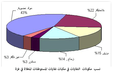 إن الكم الهائل من مخلفات الهدم الناجم عن تدمير 22 مستوطنة تم إخلاؤها، وما تحويه من نفايات خطرة كالاسبستوس التي تعد مادة مسرطنة تم استعمالها بشكل كبير في بناء المستوطنات في القطاع، ومن الضروري تحديد الكميات الموجودة منها في مخلفات الإخلاء بعد أن يتم فصلها عن ركام الأبنية وجمعها في أكياس خاصة.