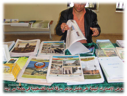 الحشوة يوم 21 آذار الماضي، من جانبه أكد رئيس دائرة الجغرافيا في جامعة بيرزيت د. عثمان شركس أن هذه الندوة تهدف إلى إبراز مشكلات المياه العالمية عامةً والمياه الفلسطينية خاصة، فهذه الندوة تشكل صرخة عالية بخطورة نهب وسرقة المياه الفلسطينية من قبل الاحتلال الإسرائيلي وسيطرته وتحكمه بالمياه التي تعتبر عصب الحياة للشعب الفلسطيني. مشدداً على ضرورة عقد مثل هذه الندوات لنشر الوعي والترشيد في استهلاك المياه، بالإضافة إلى إشراك الطلبة وإطلاعهم على آخر المستجدات في هذا المجال، حتى يتمكن الطالب من ربط الجوانب النظرية التي يدرسها بالتطبيقات العملية. وأوضح ممثل معهد الصحة العامة والمجتمعية في جامعة بيرزيت د. نضال محمود أن السيطرة والتحكم بحوض نهر الأردن ومصادر تغذية الأحواض المائية في فلسطين كانت من أهم الأسباب التي دفعت إسرائيل لاحتلال الضفة الغربية عام 1967، مشيراً إلى أنه لا تزال كافة مصادر المياه الفلسطينية السطحية والجوفية تخضع لعمليات السيطرة والنهب والاستنزاف من قبل الإسرائيليين وبذلك حرمان الفلسطينيين من الانتفاع بمصادرهم المائية.