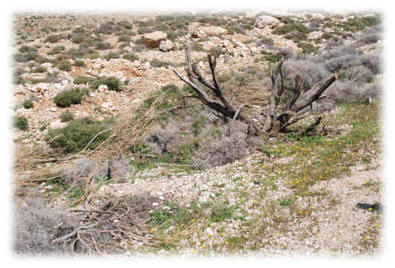 Retama raetam (Forssk) Webb نيسان 2009 شجرة الرتم تم قطعها من قبل البدو القاطنين في المنطقة من أجل إستخدامها في التدفئة والطبيخ وعمل منتجات الألبان. تعتبر عملية التحطيب من العمليات التي تساعد وتسرع تدهور الغطاء النباتي الطبيعي في السفوح الشرقية وبخاصةً النباتات الشجرية والدائمة. |