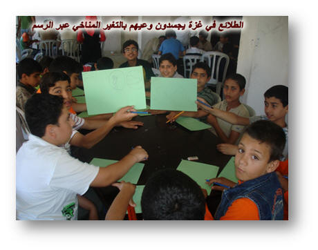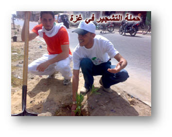 الدولية ومنظمة الأوكسفام البريطانية، كما تم القيام بحملة تشجير واسعة من قبل مجموعات أخرى من المتطوعين قاموا بزراعة 500 شجرة من أنواع متعددة نفذت في عشر مناطق على طول القطاع، وذلك بالتعاون مع برنامج خلق فرص عمل، وارتدى المتطوعون خلال الحملة بلايز وقبعات تحمل شعار يوم البيئة العالمي 2009 . وفي نفس الوقت قامت مجموعة من الفنانين المتميزين والمتطوعين في مركز معاً برسم جدارية على الحائط المواجهة للبوابة الجنوبية للمجلس التشريعي حيث هناك حركة مرور نشطة من جميع أنحاء القطاع وذلك ليتسنى لأكبر عدد من سكان القطاع رؤيتها لتعكس أسباب التغير المناخي و آثاره على البيئة. كما تضمنت الحملة أيضا مجموعة من السبوتات الإذاعية التي تتحدث عن التغير المناخي أسبابه وآثاره، وبثها خلال بعض الإذاعات المحلية حيث تحمل شعار يوم البيئة العالمي لهذا العام وذلك بأساليب إذاعية متميزة تستهدف كافة شرائح المجتمع الفلسطيني. بالإضافة إلى تصميم وإخراج مقطع فيديو من قبل وكالة أنباء راماتان يصف تأثير الحرب على قطاع غزة وأثره على تغير المناخ.