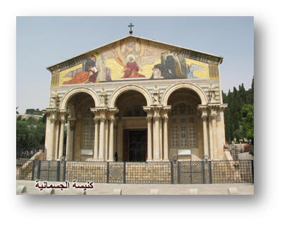 كنيسة الجسمانية اقيمت الكنيسة في محاذاة بستان الزيتون وتضم الصخرة حيث صلى السيد المسيح واكتأب. لذلك نرى أن ثيودوسيوس بنى في هذا المكان كنيسة بين(379-393)، ذكرتها الراهبة ايجيريا في مفكرتها. وقد هدمها الفرس سنة (614) ولكن المواطنين المسيحيين أعادوا بناءها خلال حكم الصليبيين، وهدمت هي الأخرى وبقيت بعض أثارها الى أن ابتاع المكان كما أسلفنا الآباء الفرنسيسكان واخذوا في الحفريات الاثرية ما بين سنة(1891-1909) وظهرت لهم بقايا الكنائس السابقة وفي سنة (1924) تم بناء الكنيسة الحالية. ومما يذكر أنهم في آن واحد قاموا ببناء كنيسة التجلي على جبل طابور. الكنيسة من تخطيط المهندس الإيطالي الشهير انطونيو برلوتسي تدعى كنيسة الجسمانية وأيضا كنيسة النزاع؛ لأنها المكان الذي قاسى فيه السيد المسيح آلام الموت، لأن عرقه الذي شابه قطرات الدم يدل على اقسى حزن وألم يجابهه الإنسان. قال يسوع: "إن نفسي حزينة حتى الموت" ولكن يحلو للبعض أن يدعوها كنيسة جميع الشعوب لكونها شيدت من تبرعات شعوب عديدة، وتحمل قبابها الاثنتي عشرة في داخل كل منها شعار البلد الذي قدم تبرعاته.