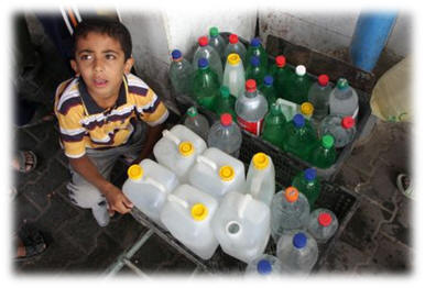 وقفت الحاجة أم بكر عبد العظيم، وهي تحمل " وعاء" تنتظر وصول المياه إلى منزلها في حي الدرج شرق مدينة غزة، بعد أن طال غيابها وتجاوز الوقت المحدد الذي تحدده البلدية ويصل إلى "48" ساعة. وتحاول عبد العظيم "62" عاما أن تسمع صوتها لجيرانها علهم يزودونها بجالون من المياه كي تتمكن من الوضوء، وبخاصة لأن المياه التي تم تخزينها في براميل كبيرة على أسطح المنزل قد فرغت بعد أن تم استخدامها بصورة متواصلة خلال الأيام الماضية، حيث لم تصل المياه إلى المنزل إلا دقائق معدودة . الحاجة أم بكر ليست وحدها التي تعاني من نقص كمية المياه إضافة إلى رداءتها، ولكن مليون ونصف المليون مواطن يعانون جراء تلك المأساة التي باتت تلقي بظلالها على حياة السكان وتجاوزت ذلك لتنعكس سلبا على صحتهم. |