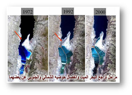 سنويا، أي حوالي عشرة سنتيمترات شهريا، بما في ذلك أثناء فصل الشتاء. ليس هذا فقط، بل إن إسرائيل حولت نهر الأردن الذي كان يختزن، عبر العصور، قيما تربوية ودينية وبيئية وسياحية - حولته إلى نهر فقير بالمياه، مشوه المعالم ومرتعا للمياه العادمة غير المعالجة. ويمكننا أيضا ملاحظة جفاف منابعه وروافده التقليدية التي دأبت إسرائيل على سرقتها وتحويلها إلى وجهات أخرى. ويعد ذوبان الثلوج والتساقطات في سوريا من أهم المصادر المائية المغذية للبحر الميت؛ إذ تتدفق هذه المياه نحو الجنوب وصولا إلى نهر الأردن وبحيرة طبرية، مما يعمل على تعبئة المقطع الشمالي من البحر الميت، حيث يتم قياس مستوى البحر. ومنذ الخمسينيات، سدت إسرائيل جميع المصادر المائية المغذية للبحر الميت. كما أن مصانع البحر الميت الإسرائيلية التي تعمل منذ عشرات السنين وتضخ سنويا أكثر من 250 مليون متر مكعب من الحوض الشمالي للبحر الميت، تعد مسئولة أساسية عن التراجع السنوي في مستوى البحر الميت وبالتالي جفافه. وبسبب النهب الإسرائيلي لمياه البحر وروافده المغذية، فقد انفصل حوضاه الشمالي والجنوبي أحدهما عن الآخر، علما بأنه، حتى قبل عشرات السنين، كان الحوضان متصلين مائيا . ويتوقع الأخصائيون أن يواصل الحوض الشمالي انخفاضه بما معدله 1 – 1.5 متر سنويا، بسبب الهبوط في كمية المياه المغذية له. وحتى آب الماضي بلغ مستوى البحر الميت 423 مترا تحت سطح البحر، بينما كان ارتفاعه 413 مترا تحت سطح البحر قبل عشر سنوات، وتحديدا في آب 1999، أي أن مستوى البحر انخفض بمقدار عشرة أمتار خلال السنوات العشر الأخيرة. وبالرغم من ذلك، تم إدخال البحر الميت إلى قائمة المرشحين للفوز بموقع إحدى عجائب الدنيا السبع الجديدة، باعتباره يحوي مكونات نادرة من القيم الجمالية والطبيعية والتراثية والعلاجية، في المستويين المحلي والعالمي. وحاليا، تتدفق كميات ضخمة من المياه العادمة الإسرائيلية من مناطق القدس والسفوح الجبلية المحيطة بالبحر. وتقتصر المياه الطبيعية المتدفقة إلى البحر الميت، في الينابيع الشمالية الغربية مثل عين فشخة وعين فارة، بالإضافة لمياه الفيضانات.