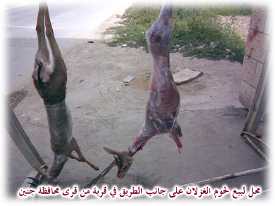 عدسة وتعليق: عبد الباسط خلف في قرى وبلدات بمحافظة جنين، يتفاخر صيادون بأنهم استطاعوا الإيقاع بغزلان، وذبحوها، وصاروا يتاجرون في لحومها. أسير والزميل أيهم أبو بكر، على إحدى الطرقات في مركبة عمومية، نشاهد جزاراً يعلق غزالين على مذبح في الهواء الطلق. نصاب بالذهول، نطلب من السائق العودة، ونتظاهر بأننا نحن إلى تناول لحم الغزال الشهي منذ أمد بعيد. يعود سائقنا ونهبط إلى الجزار، نشاهد غزلاناً معلقة، وكأنها تبكي بدمها المسفوح، الذباب يحتل لحمها وعيونها تلمع، وقرونها تذكرنا بالحياة البرية المهددة.