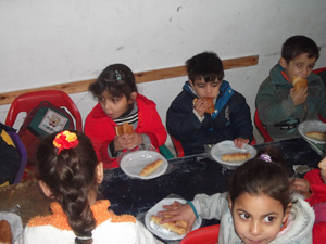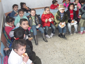 أطفال غزيون يتناولون المنتجات الغذائية التي أنتجتها تعاونيات نسائية |