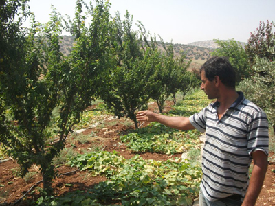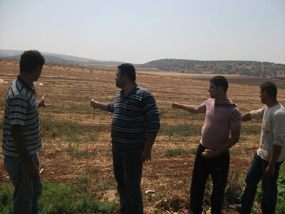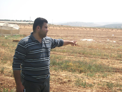 المهندس علاء يشير إلى قطعة أرض مركز معا في بيت قاد قرب جنين المخطط أن تتحول إلى مزرعة عضوية نموذجية إلا أن الاحتلال دمر منبع مياهها الوحيد |