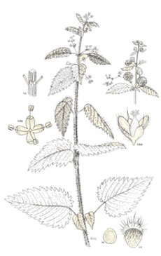 وصف النبتة: نبات عشبي، يتراوح ارتفاعه بين 10-50سم، وحيد المسكن، يغطيه شعر مبعثر مهيج للجلد عند الملامسة. الساق قائم، متفرع من القاعدة، رباعي الأضلاع. الأوراق بيضاوية أو إهليجية، تستدق في قاعدتها، يصل طولها إلى 8 سم، وعرضها 4 سم، حوافها مسننة بأسنان حادة. الأذينات صغيرة عددها 4 على كل عقدة (اثنتان على قاعدة كل عنق). النورات إبطية، تشبه السنبلة.