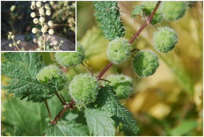 الازهار مؤنثة تنتج كروية الشكل، ومحيطها حوالي 1.3 سم. وكذلك تتكون من عناقيد تحتوي على بعض الأزهار المذكرة وكثير من الأزهار خضراء ولا يوجد لها تويج. يبلغ قطر الأزهار المذكرة حوالي 1 ملم، والمؤنثة 2-2.5 ملم. البذور بيضاوية، طولها 1.5-2 ملم، منضغطة قليلاً.