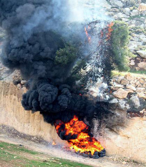حرق إطارت مطاطية وامتداد النار لتحرق الأشجار |