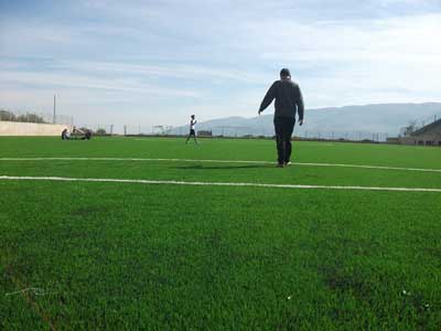 ملعب في مخيم الفارعة بالعشب الصناعي، مشهد جميل، ولكن رائحة المطاط تقتحم اللون الأخضر.