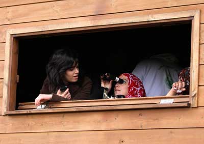 ناشطات فلسطينيات يراقبن الطيور في محطة المراقبة بمدرسة التعليم البيئي في بيت جالا |