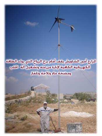 "أحافظ على أرض غيري" يقول: أنا هنا أحافظ على أرضي وأرض الجيران، وأتبنى فكرة الإنتاج، لدرجة أن الأعلاف التي أقدمها للأغنام والماعز منتجة محلية من الجبل، كالقمح والشعير والذرة. مثلما أفكر في الاستغناء عن المولدات الكهربائية، وأخطط لإنتاج الطاقة من الضوء. يُفصّل: قبل عام، انتقلت من العمل بإنتاج الكهرباء عبر مولد ديزل إلى توليدها بواسطة الرياح، فبنيت بمساعدة المهندس مؤيد حمد مروحة هوائية، وصرت أستخدم الطاقة النظيفة، التي تكفي لتشغيل التلفاز لساعتين وآلة حلب الأغنام ومضخة ماء وثلاجة. وتتحول الطاقة عبر محول إلى بطاريات، ثم تنتقل منها لمحول ثانٍ لتتغير من طاقة رياح إلى طاقة كهربائية. يروي: كلفني المشروع ستة آلاف دولار، ولو أردت أن أرتبط بشبكة الكهرباء لاحتجت إلى أكثر من ثلاثين ألف دولار تقريباً. أما القدرة الكهربائية الناتجة من الهواء فتعتمد على قوة الرياح، غير أنها تعتبر عاملاً مساعداً، إذ تنتج نحو 10 أمبير كل ساعة، وهو ما يوفر جزءا لا بأس به من احتياجات المحروقات مرتفعة الثمن، لتشغيل مولد الكهرباء. ثروة