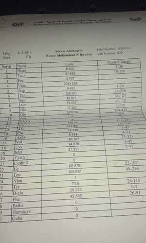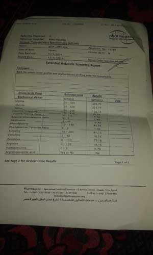 | نتائج التحاليل الخاصة بالطفل محمد صالح في المختبرات المصرية |