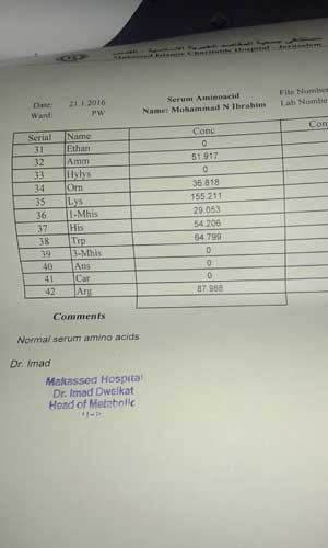 والد الطفل وبعد معاناة طويلة لاستصدار تحويلة طبية لمشافي الضفة الغربية تمكن بعد عناء من إجراء جملة من التحاليل الطبية، ومن ضمنها تحليل للجينات الوراثية حيث لم يثبت ولم يُظهر تحليل الجينات أية علاقة بين صلة القرابة البعيدة بين الزوجين لإمكانية حدوث الأعراض الموجودة لدى الطفل، بعد أن اجرى هذه التحاليل وعلى نفقته الخاصة لقطع الشك باليقين.