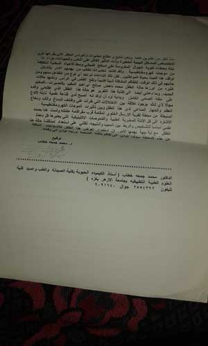 | إفادة الدكتور محمد خطاب أخصائي الكيمياء الحيوية |
