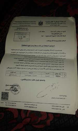 يتابع ابراهيم: "توجهت لعدة مؤسسات برسائل قدمتها شخصيا منها لسلطة جودة البيئة (حصلت منها على كتاب توافق فيه على تركيب المحطة)، كما حصلتُ على كتاب آخر من قبل دائرة التراخيص بوزارة الاتصالات التي افادت بأنها لا تمانع من اقامة المحطة بعد استيفائها للشروط المطلوبة".