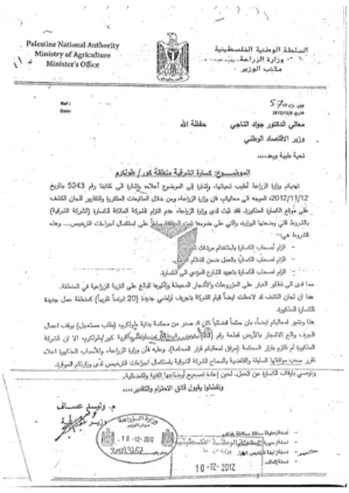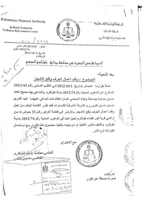 وحول أراضي الزيتون المتضررة من الكسارة، نفى التكروري بدايةً الأمر برمته، لكن مع مواجهته من قبل معدتي التحقيق بالصور، أعلن عن استعداده رش الشجر المتأذي بالمياه والتسوية مع المجاورين عبر إيجاد حلول مُرضية لهم. مؤكداً أن كل القضايا التي رفعت ضدهم لإيقاف عملهم نهائياً لم تنجح لعدم إثبات إضرارهم بالبيئة. وعندما طلبت معدتا التحقيق من التكروري الحصول على الدراسة الخاصة بتقييم الأثر البيئي من مالك المنشأة رفض اطلاعهما عليها.