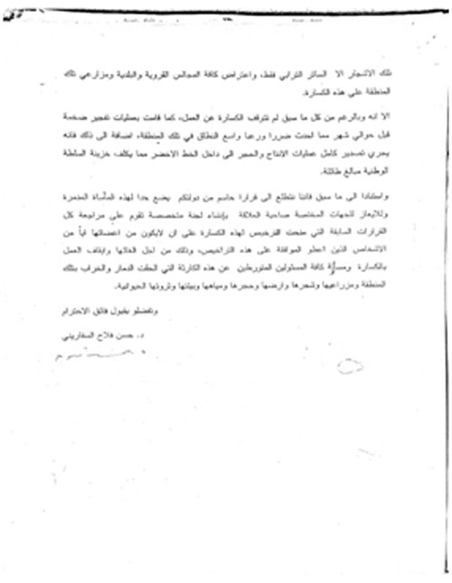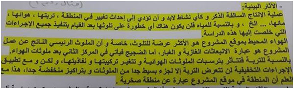 - في الملخص التنفيذي للدراسة الأولى في هذا المخلص وتحت بند الآثار البيئية يأتي ذكر عملية الإنتاج، وبأنها لن تؤثر على المياه الجوفية في المنطقة بعد القيام بالإجراءات التخفيفية، وبالعودة إليها، نرى أن الحديث أقتصر على تلوث الهواء فقط، ولم يتم ذكر أي إجراءات لتخفيف الضرر بالمياه أو التنوع الحيوي البري أو النباتي.
