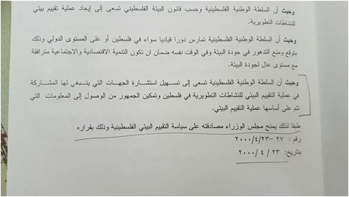 صورة عن قرار المصادقة على سياسة التقييم البيئية الفلسطينية رقم 27- 23-نيسان 2000،