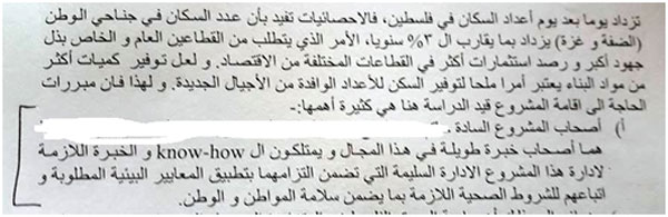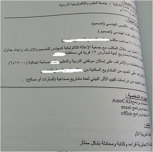 فيما أطلعت معدتا التحقيق على سيرة ذاتية للمهندس صاحب شركة هندسية أخرى من شمال الضفة الغربية تعد دراسات التقييم البيئي، وكما يظهر للوهلة الأولى فلا يوجد أي معرفة أو خلفية أكاديمية بيئية.