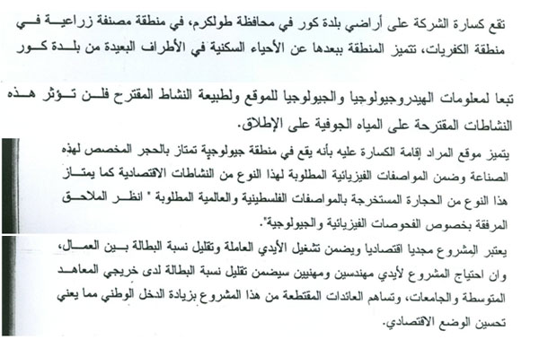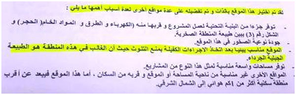 دليل ذلك، ما ورد بالنص الصريح وعلى الرغم من اعتراف الدراسة بأن المنطقة تصنف زراعية، إلا أنها ركزت على الجانب الاقتصادي البحت من كون طبيعة المنطقة الجيولوجية تتميز بالحجر الأبيض المخصص لهذه الصناعة، وتوفير فرص عمل....الخ وهذا يتضح من النصوص التالية:
