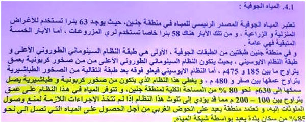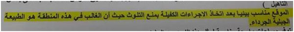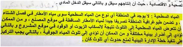 - بالإشارة إلى نفس الفقرة السابقة، هناك تناقض واضح مع الفقرات اللاحقة، والتي تتحدث أيضا عن إمكانية تلوث المياه الجوفية، والتي تعد مصدراً رئيسياً للبلدة.