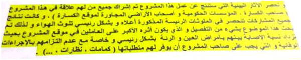 - في الصفحة الثانية من الدراسة وخلال الحديث عن الآثار البيئية للمشروع تقول الدراسة: "تم إشراك جميع من لهم علاقة في هذا المشروع ( صاحب الكسارة والمؤسسات الحكومية وأصحاب الأراضي المجاورة) وكانت نتائج المشاركات تنحصر في الملوثات الرئيسية وبشكل خاص تلوث الهواء". وهو ما يتناقض مع جوهر إعداد الدراسات بالتركيز على التنوع الحيوي والبيئي للمنطقة بشكل كامل.
