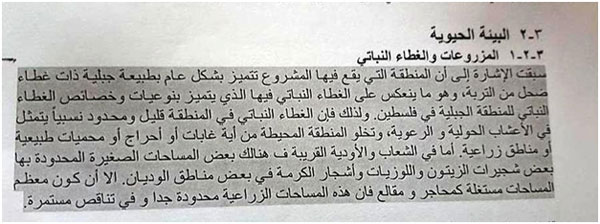 وذلك يتناقض مع طبيعة محافظة جنين والتي تشتهر بتنوعها البيئي والحيوي، وفي نفس الدراسة هناك إشارة لوجود منطقة شجرية قريبة، ولكن التقليل من ذلك، بالإشارة إلى أنه من غير المتوقع أن تتأثر هذه الأشجار.