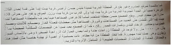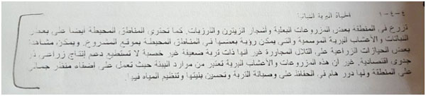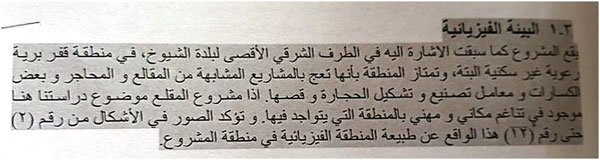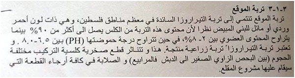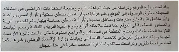 في الفقرة التالية، أشير إلى أنه تم زيارة الموقع وفحص أنواع التربة ( لم يتم الإشارة لأي خبير أو أكاديمي أعدّ الفحص، كما تم الإشارة لملاحظة التنوع الحيوي البري والنباتي استنادا على البيانات الرسمية، هل تقييم المنطقة بيئياً يستند عليه من خلال الجهاز المركزي للإحصاء ووزارة الاقتصاد، أم زيارات ميدانية يعدها خبراء في هذا المجال!!!