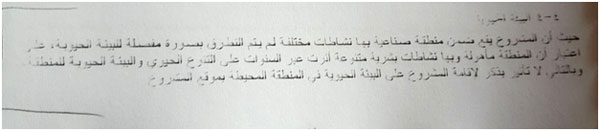 نلاحظ بالفقرة التالية الإشارة إلى أن المصنع يبعد عن التجمعات السكنية ا كيلو متر ، فيما يشير القانون إلى ضرورة ابتعادها ذات المسافة عن المناطق الطبيعية، فما بالكم السكنية والتي يجب أن تكون المسافة أكثر من ذلك .