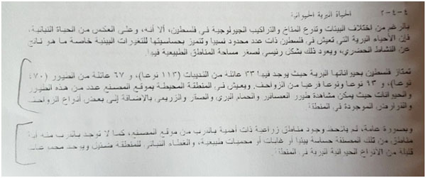 نلاحظ في الفقرة التالية، عند الحديث عن الحياة البرية، عدم تحري الدقة في تحديد أصناف الطيور والزواحف، بل جاء الحديث عنها غير مدعم بأي مراجع علمية ( الفقرة الثانية)، أما الفقرة الثالثة فتناقض الحديث السابق عن حيازات زراعية وأشجار زيتون ولوزيات، حيث ذكر أنه لم يلاحظ وجود مناطق زراعية ذات أهمية! ألا تعد أشجار الزيتون وبعض الحيازات الزراعية ذات أهمية لأصحابها، ومن يحدد مفهوم الأهمية ؟؟؟ هل هو المهندس الذي أعد الدراسة؟