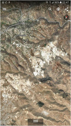الدمار في محافظات فلسطين الجنوبية والوسطى نتيجة عمل الكسارات ومقالع الحجر منذ سبعينيات القرن الماضي كما يظهر على الجوجل ايرث.