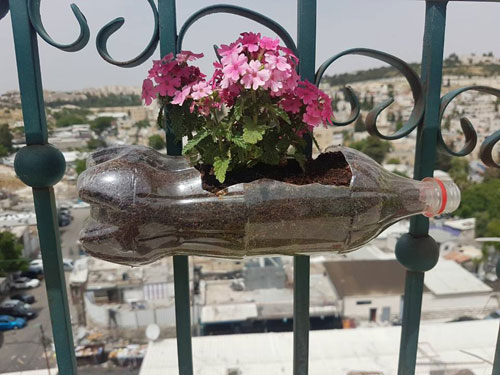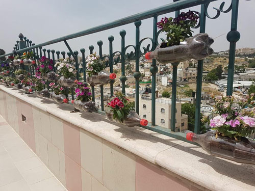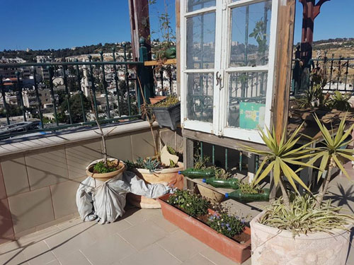 شرفة المقدسي مصطفى الكالوتي وقد زينت بعشرات القناني البلاستيكية التي زرع فيها نباتات الزينة وبعض الأعشاب الطبية |