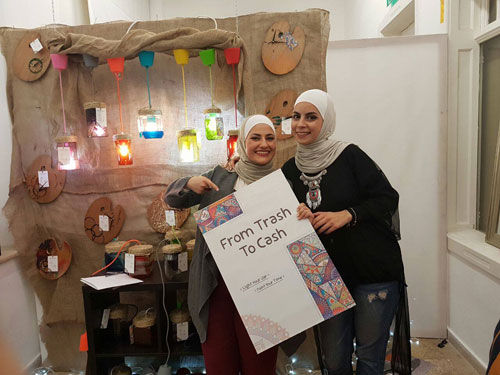 تدوير المرطبانات الزجاجية إلى مصابيح كهربائية في حوش الفن الفلسطيني بالقدس |