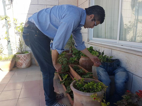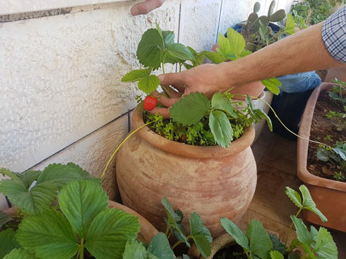 | مصطفى الكالوتي بالقدس يزرع توت أرضي في قواوير فخارية |