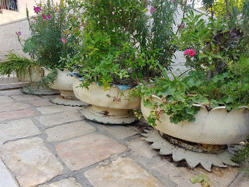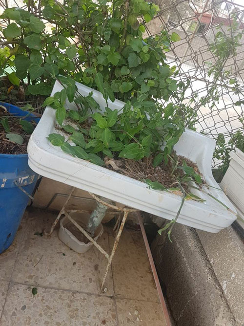 مغسلة قديمة حولتها أم علي أبو غزالة إلى حوض للزراعة