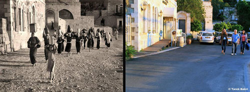 فتيات يحملن جرار الماء من عين عذراء مريم المجاورة لمسجد عمر بن الخطاب في قرية عين كارم قبل احتلالها الإسرائيلي عام 1948 (يسار) وذات الحي كما يبدو اليوم(يمين) |