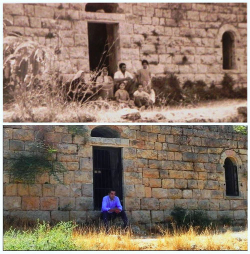 عائلة الدقاق أمام منزلها الذي احتله الصهاينة عام 1948-كما يبدو اليوم (يمين) وذات المنزل قبل عام 1948(يسار) |