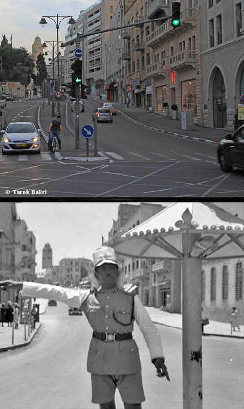 | شرطي فلسطيني ينظم حركة السير في أحد شوارع القدس(قبل احتلال 1948) - (الصورة السفلى) وذات الشارع كما يبدو اليوم (الصورة العليا) |