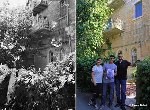 | شكري الجمل مع أسرته أمام منزله في حي الطالبية في القدس قبل عام 1948(يسار) وذات المنزل كما يبدو اليوم (يمين) |