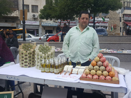 كان لافتا في أرض الساحة، ذلك الرجل الستيني يوسف أبو ريان من حلحول شمال الخليل، الذي كان ممثلا لجميعة حماية وتطوير البذور البلدية التي تنتج 16 نوعا من البذور البلدية كالحبوب والخضروات الصيفية والزراعات الشتوية. على طاولته عرض أبو ريان مجموعة من الأكياس الصغيرة بداخلها بذور من أصناف مختلفة إلى جانب بعض أكياس الزبيب والملبن ومربى العنب "العنبية". يبين أبو ريان أن البذور البلدية تتلائم مع الظروف الجوية في بلادنا، عدا عن كونها طبيعية خالية من المبيدات، خلافا للبذور المستوردة غالية الثمن التي تعتمد بالأساس على المبيدات والكيماويات.