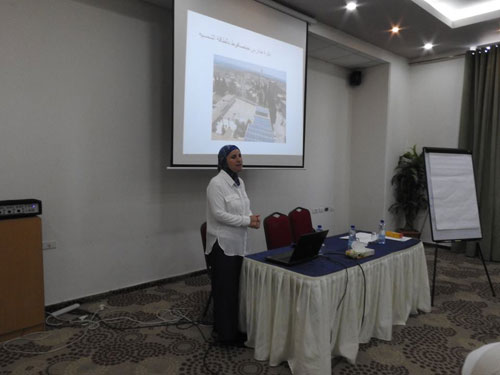 | ناديا الخضري مديرة مرفق البيئة العالمي في الأاراضي الفلسطينية أثناء ورشة التشريعات المحلية والاتفاقيات البيئية الدولية |