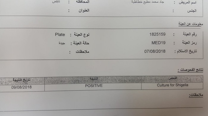 نموذج لفحوص أجرتها وزارة الصحة لجرثومة الشيغيلا |