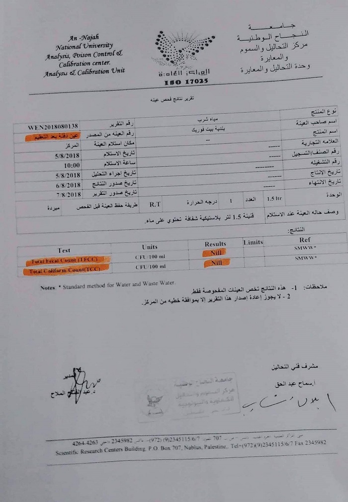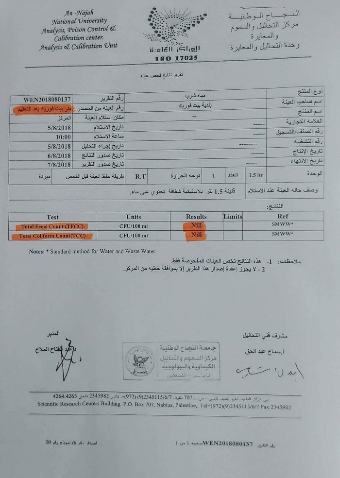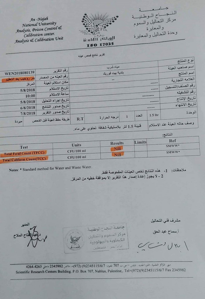 فحص مخبري في جامعة النجاح أجرته بلدية بيت فوريك |