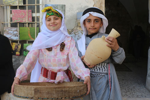 | أطفال فلسطينيون يعرضون الأدوات والمقتنيات والملابس التراثية |