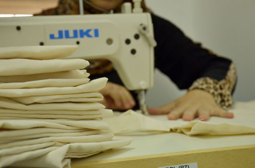 "كان لكل سيدة مهمة احداهن تتولى الحياكة وأخرى مهمة قص الأقمشة أو خياطتها، كان في البداية أداؤنا بطيئاً لكن أصبحنا ننتج 50 كيساً يومياً حتى وصلنا إلى إنتاج 250 كيساً" تقول منال علقم 38 عاماً، إحدى السيدات المشاركات في خياطة الأكياس.