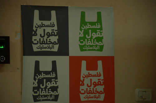 وزع القائمون على مبادرة الأكياس البيئية التي تم إنتاجها كتابات تشجع على استخدامها باللغتين العربية والإنجليزية تحت عنوان "خليك صديق للبيئة بكفينا بلاستيك"؛ وذلك مجاناً على نساء المخيم؛ أما ما تبقى منها فقد تم نصبها في نقاط محددة داخل المحلات التجارية في المخيم وفي مدينة رام الله.