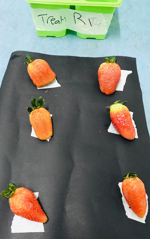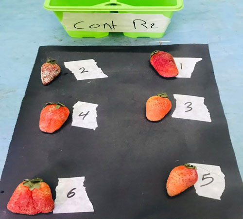 الفراولة التي أجرت عليها التجربة، كانت بكمية 12 كغم، منها ما كان جزء تالف ومنها ما هو غير مطابق للمواصفات، فيما تبّقى 9 كغم، قسّمتها لثلاثة أقسام، ووضعت في قسمين نسب مختلفة من الغوار( 50% / 0.75% ) فيما القسم الثالث للمقارنة، وأجرت عليها كافة الفحوص اللازمة من حيث الوزن والصلابة واللون.